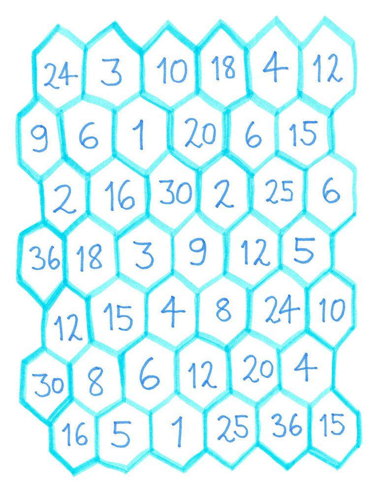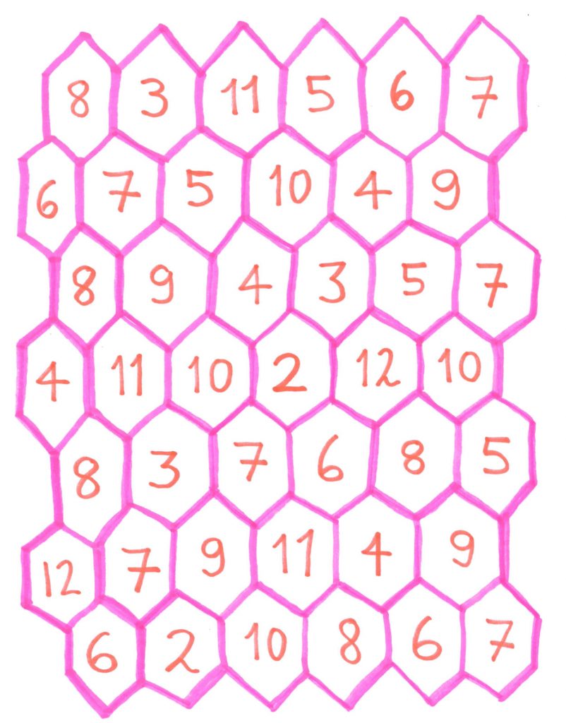 Sexhyrningaspil eða „3 í röð“ fann ég í stærðfræðibók og þurfti að prufukeyra og laga til. Spilið er mjög einfalt. Það eina sem þarf að hafa til taks eru tveir teningar og mismunandi litir, einn fyrir hvern þátttakanda. Æskilegur fjöldi þátttakenda er 2-4. Leikurinn gengur út á það að ná að lita sem flesta reiti í beinni röð. Keppendur skiptast á að kasta teningunum tveimur.