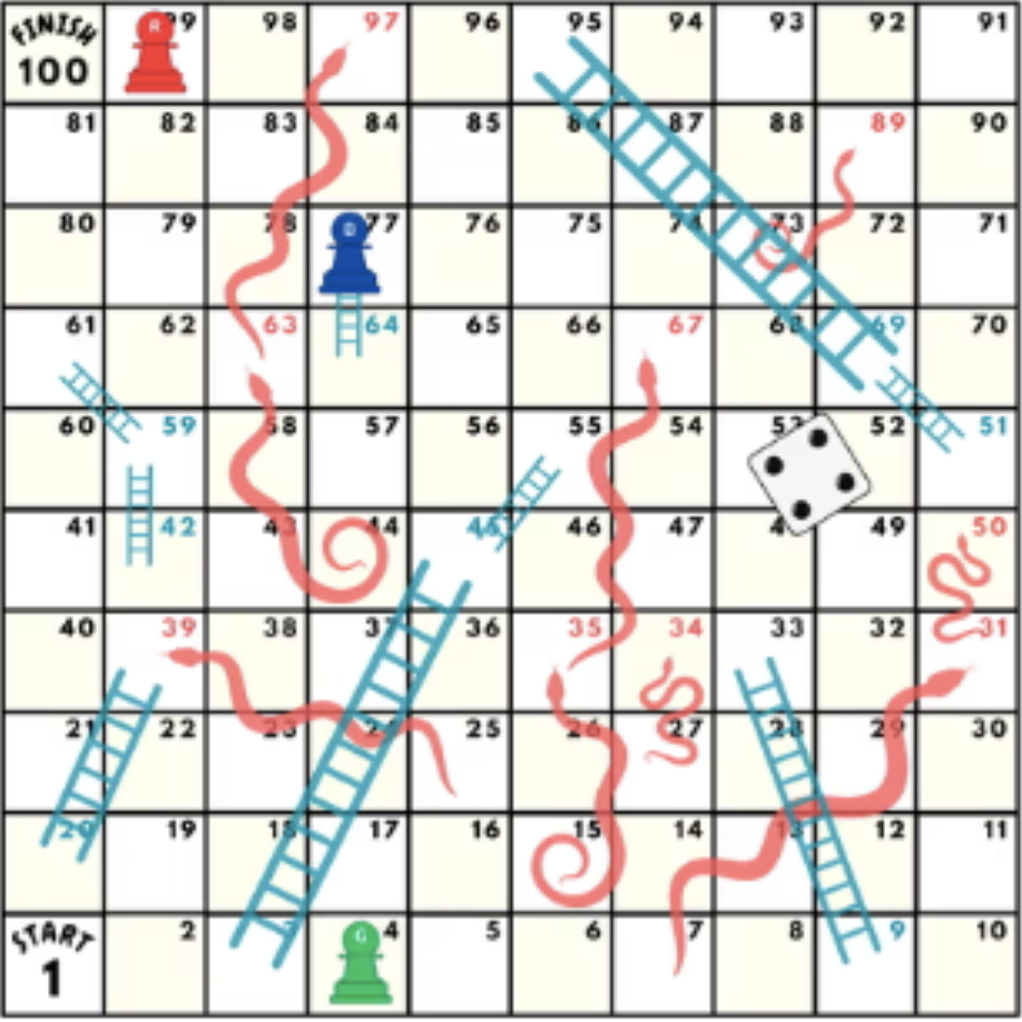 Hér sést dæmi um klassískt slönguspil þar sem hver stigi og slanga leiðir keppendur aftur og bak og áfram um borðið. Í öllum tilvikum er leikmanni beint á einn tiltekinn stað. Allt er í mjög föstum skorðum hvað það varðar.